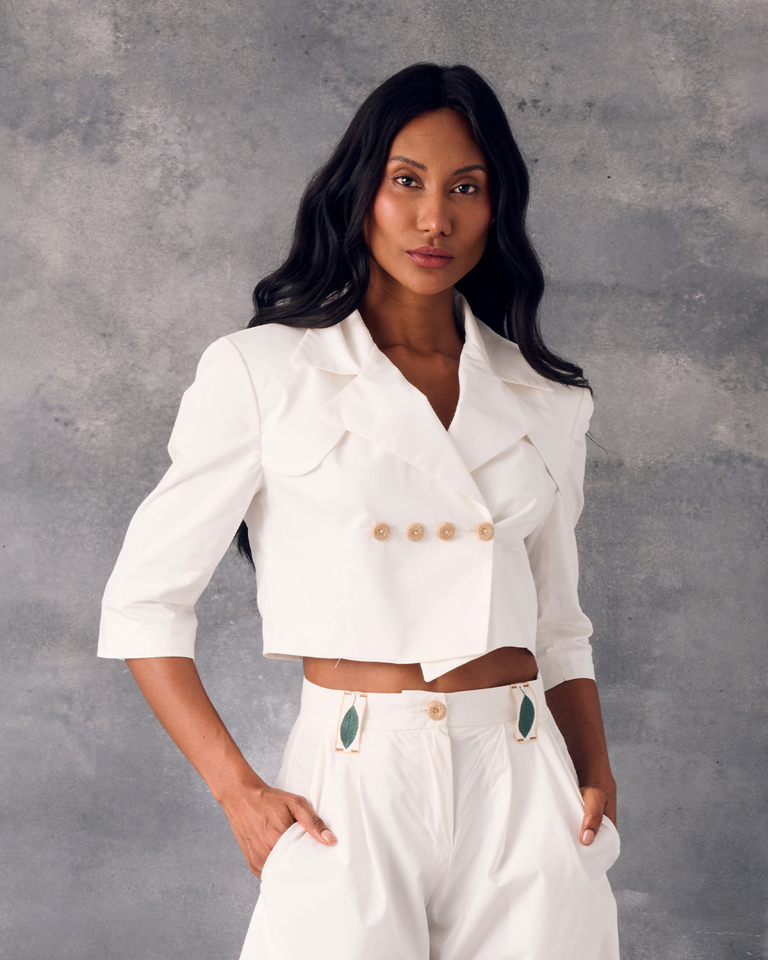 Blazer corto marfil con corte asimétrico y botones forrados en el mismo material.