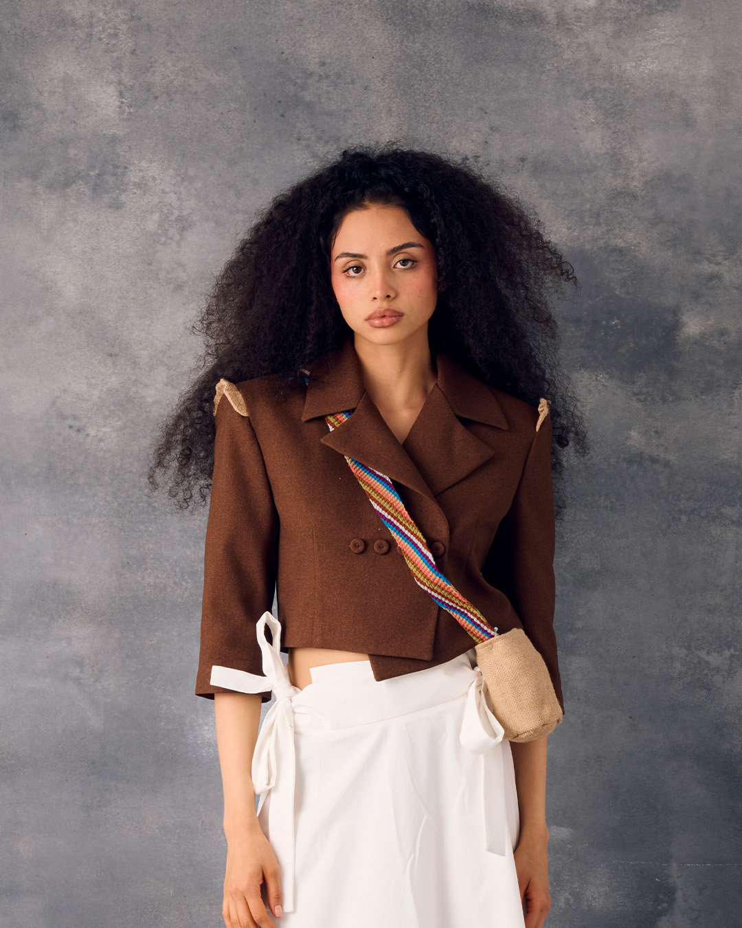 Chaqueta corta, con detalles asimétricos, apliques en Yute, botones forrados en el mismo material y forro con imágenes conceptuales.