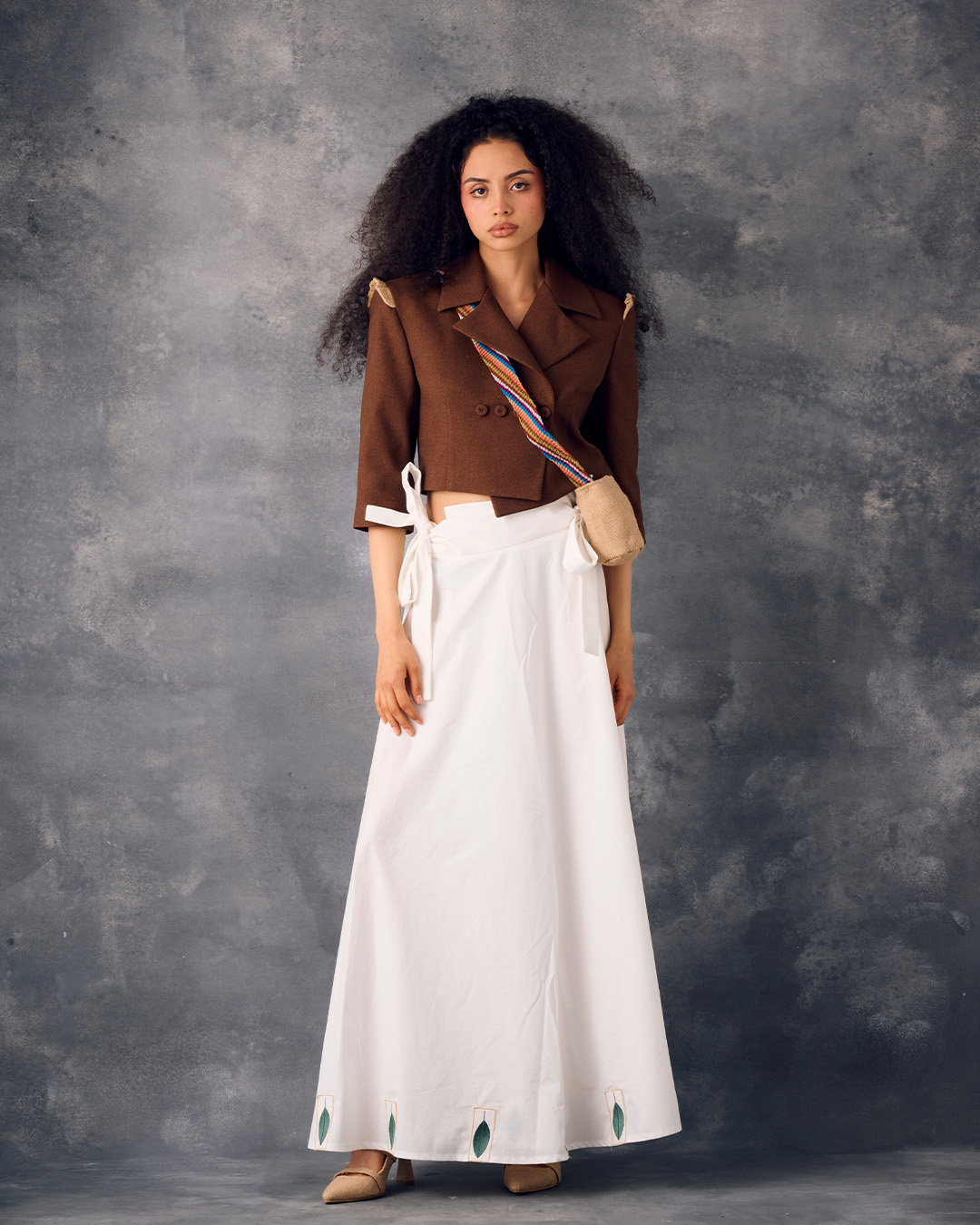 Falda pollera en algodón con bordados de la hoja de coca en la parte inferior.