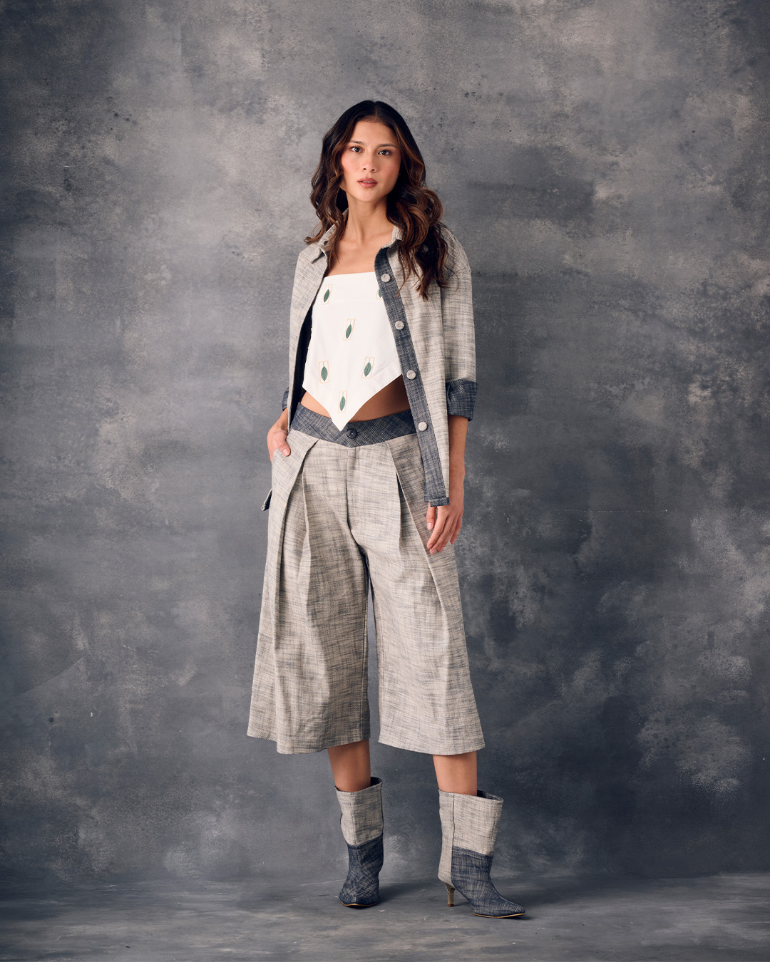 Pantalón en denim con prense encontrado, pretina a contraste y botón forrado en el mismo material.